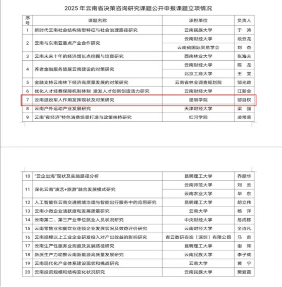 近日,2025年云南省决策咨询研究课题立项结果公布,昆明学院邹目权博士负责、学校武装部统筹申报的《云南退役军人作用发挥现状及对策研究》成功立项。该课题由省委政策研究室管理,旨在围绕省委、省政府中心工作,针对全省经济社会发展重大问题开展战略性研究,为决策提供参考。